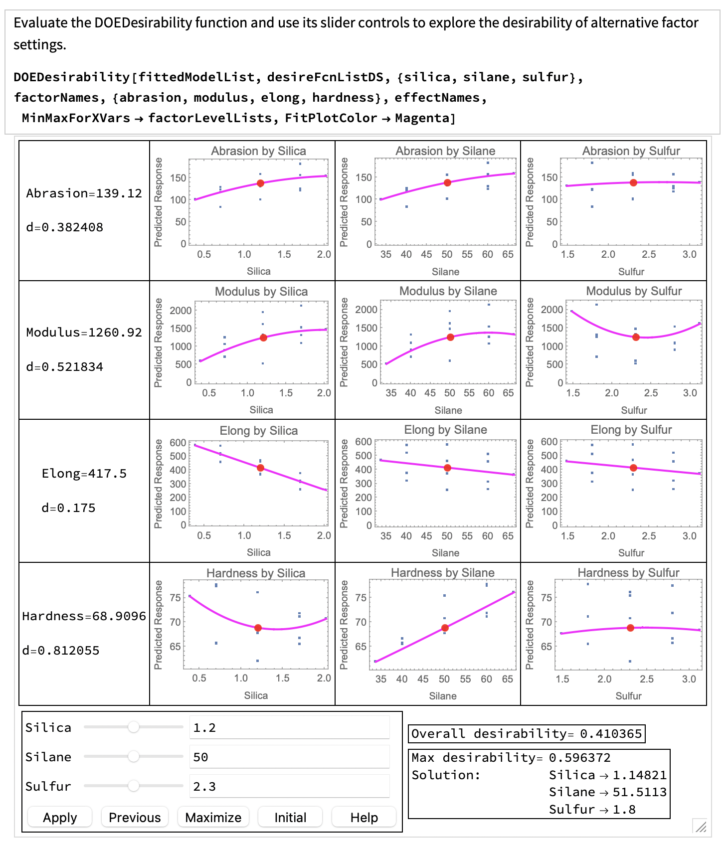 The DOEDesirability function provides slider controls that allow you to adjust the values of the independent variables in your model. Manipulating the sliders causes the desirability function for each response variable to be recomputed and its associated ListPlots to be redrawn. This allows you to interactively explore the desirability of the multiple response model for a given set of factor settings.